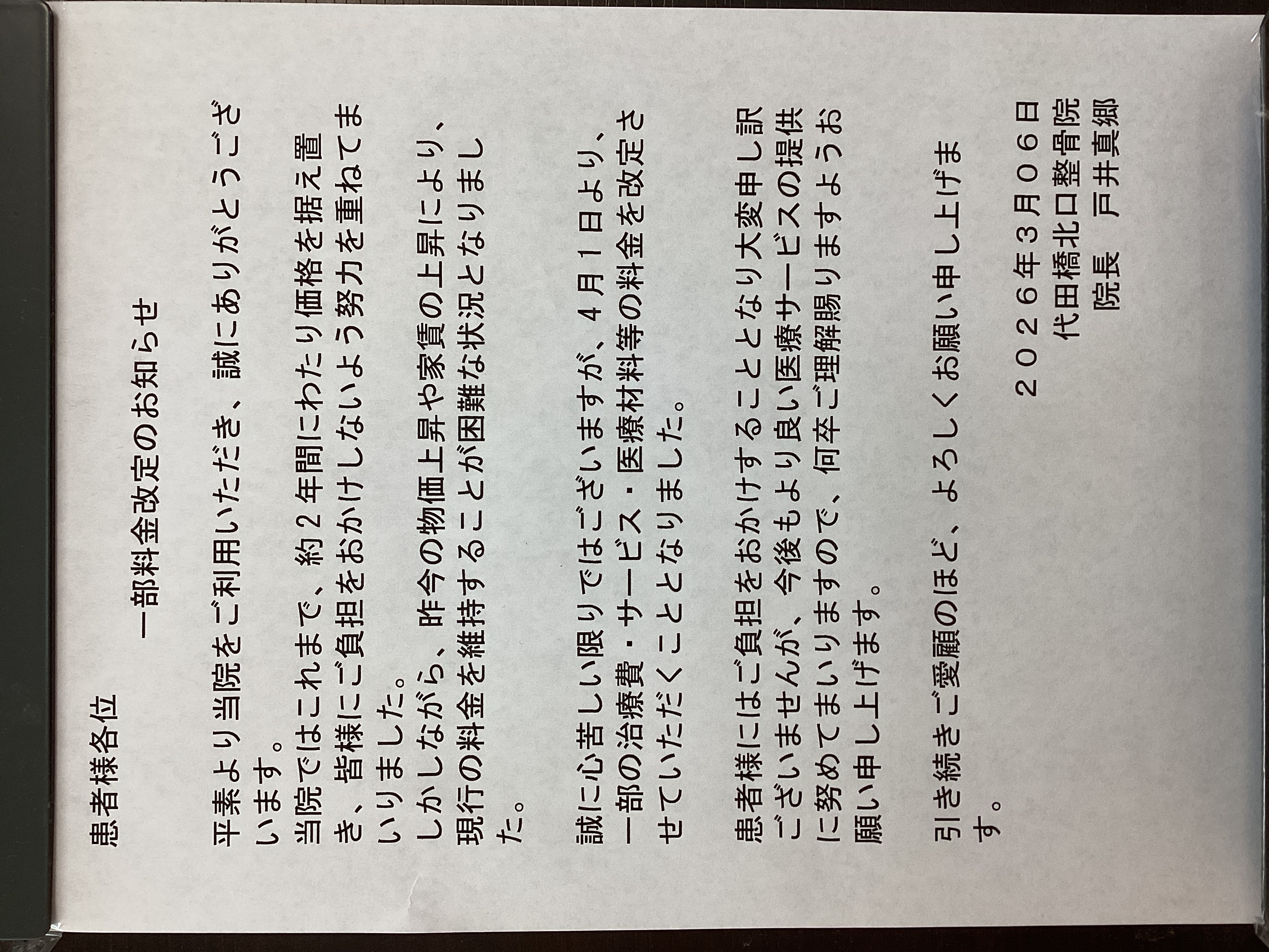 誠に心苦しい限りではございますが、4月1日より、一部の治療費・サービス・医療材料等の料金を改定させていただくこととなりました。